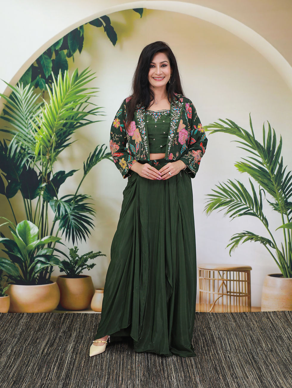 A refined pure silk black A-line top adorned with vibrant 3D-effect resham dori work on the yoke, thoughtfully finished with a soft lining. Paired with a classic plazo, this elegant set is a timeless wardrobe must-have for effortless festive and occasion wear.