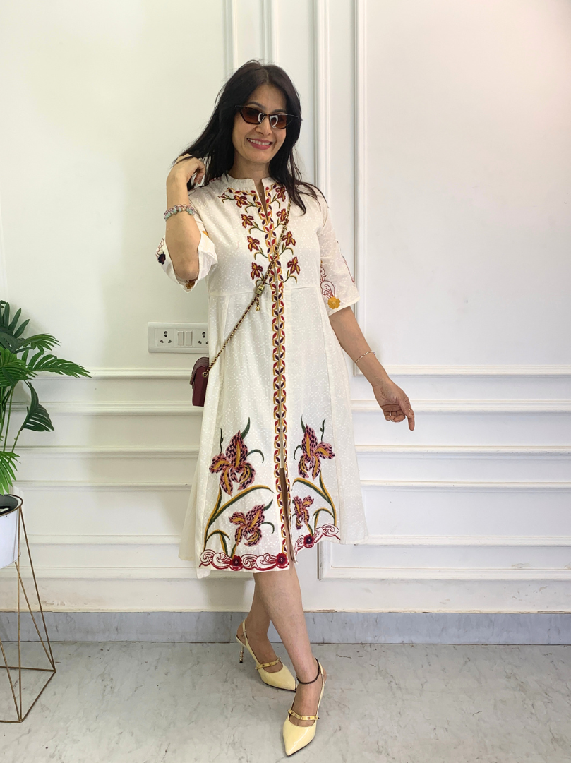 The Picnic Posh is the epitome of effortless elegance. Crafted from pure cotton with a rich weave, this dress offers a textured, high-end feel while remaining breathable and light for the summer heat. Moving away from the flare, this straight-cut dress provides a sleek, modern silhouette that’s both flattering and comfortable. The highlight is the stunning contrast embroidery that flows down the center and accents the hem, adding a vibrant, artisan touch to the crisp white base. Whether you're heading to a garden brunch or a stylish day out, this dress is your go-to for a polished, "posh" look.
